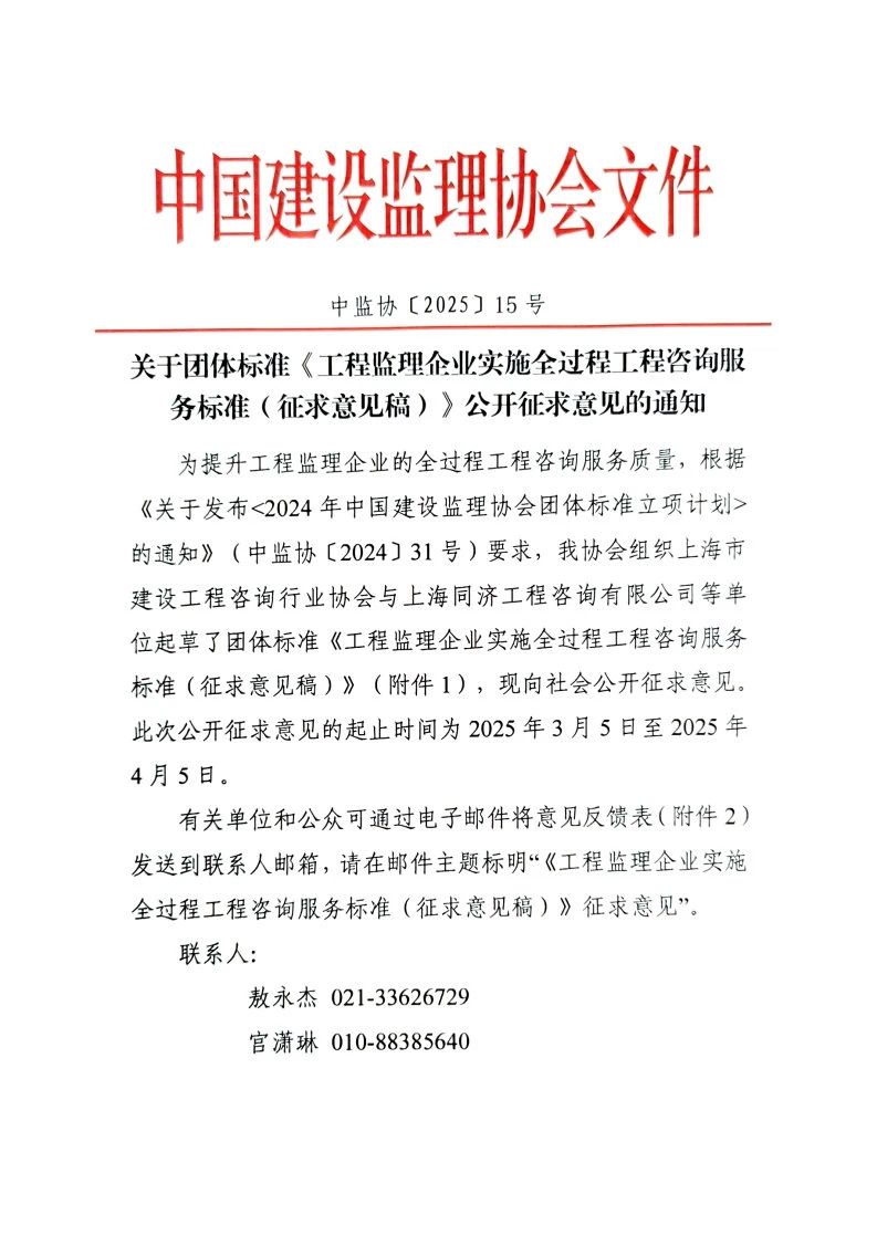 【轉(zhuǎn)】關(guān)于團體標(biāo)準(zhǔn)《工程監(jiān)理企業(yè)實施全過程工程咨詢服務(wù)標(biāo)準(zhǔn)(征求意見稿)》公開征求意見的通知